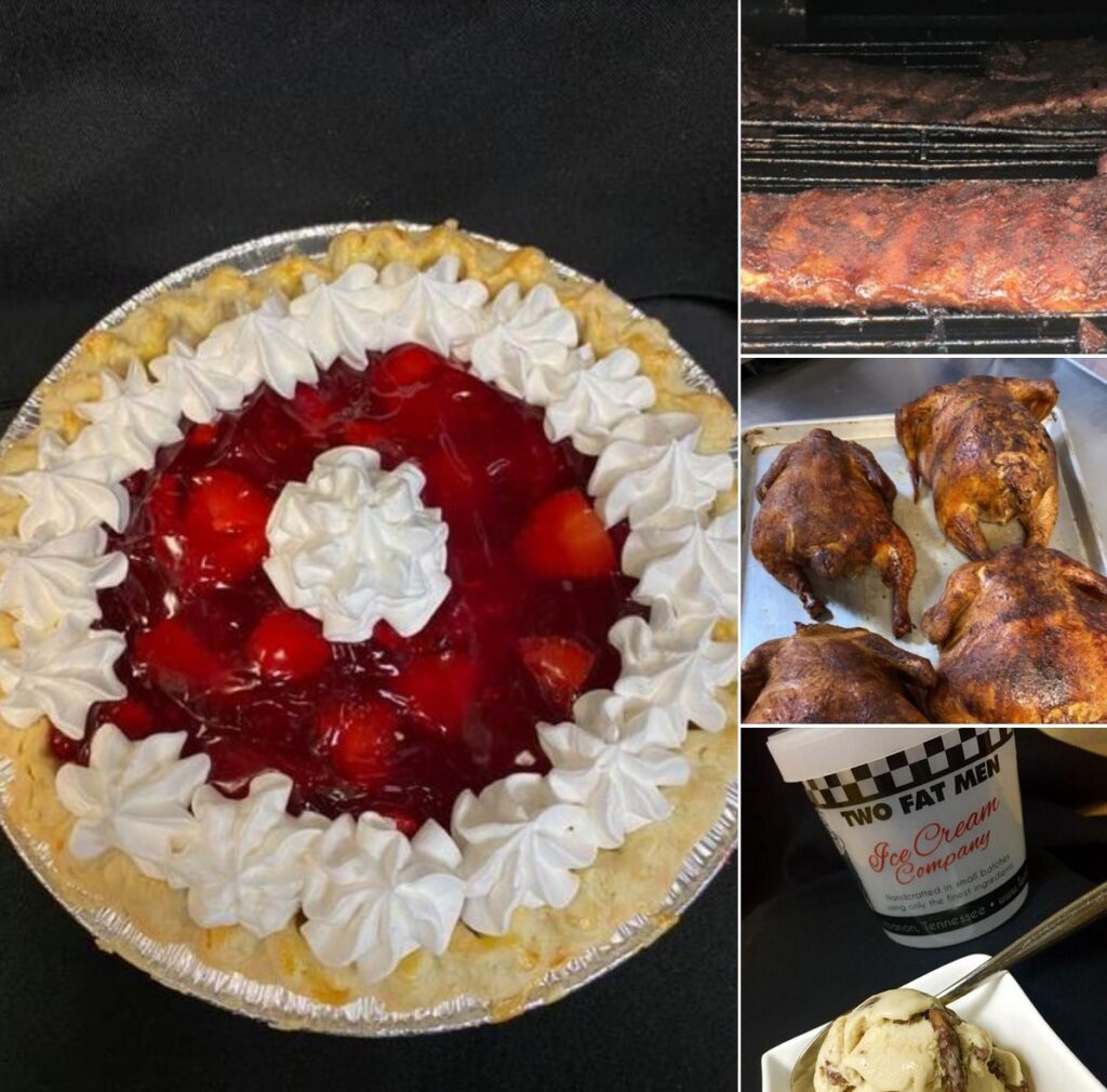 We will have smoked bologna chubs, full slabs of ribs, whole butts and whole smoked chickens. We will also have sides and desserts, including homemade ice cream!